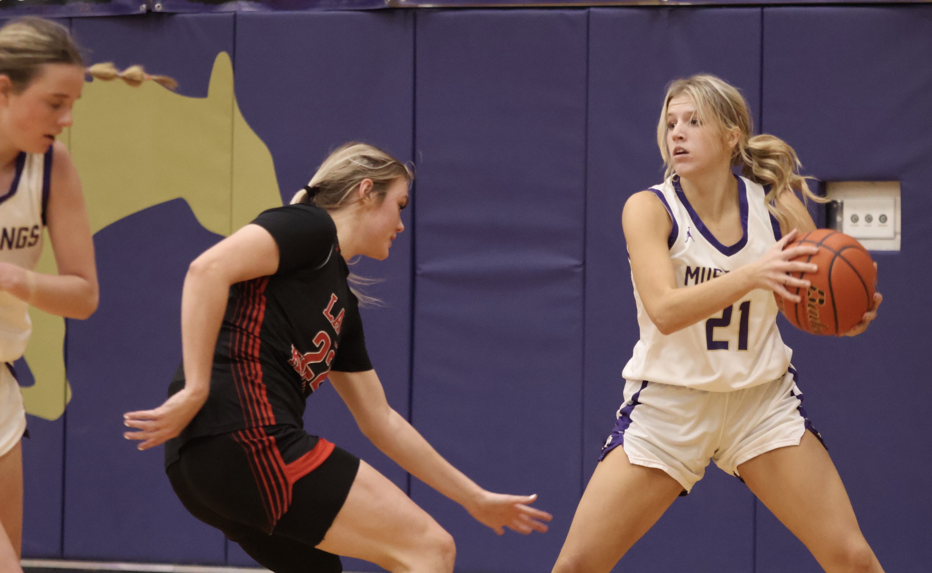 CAPTION: On the basketball court, Kylie Roberts (right) played any role the Lady Mustangs needed. Sometimes she was on the low block or at the top of the key or running the offense as the point guard. Staff photo by Jennifer Fierro