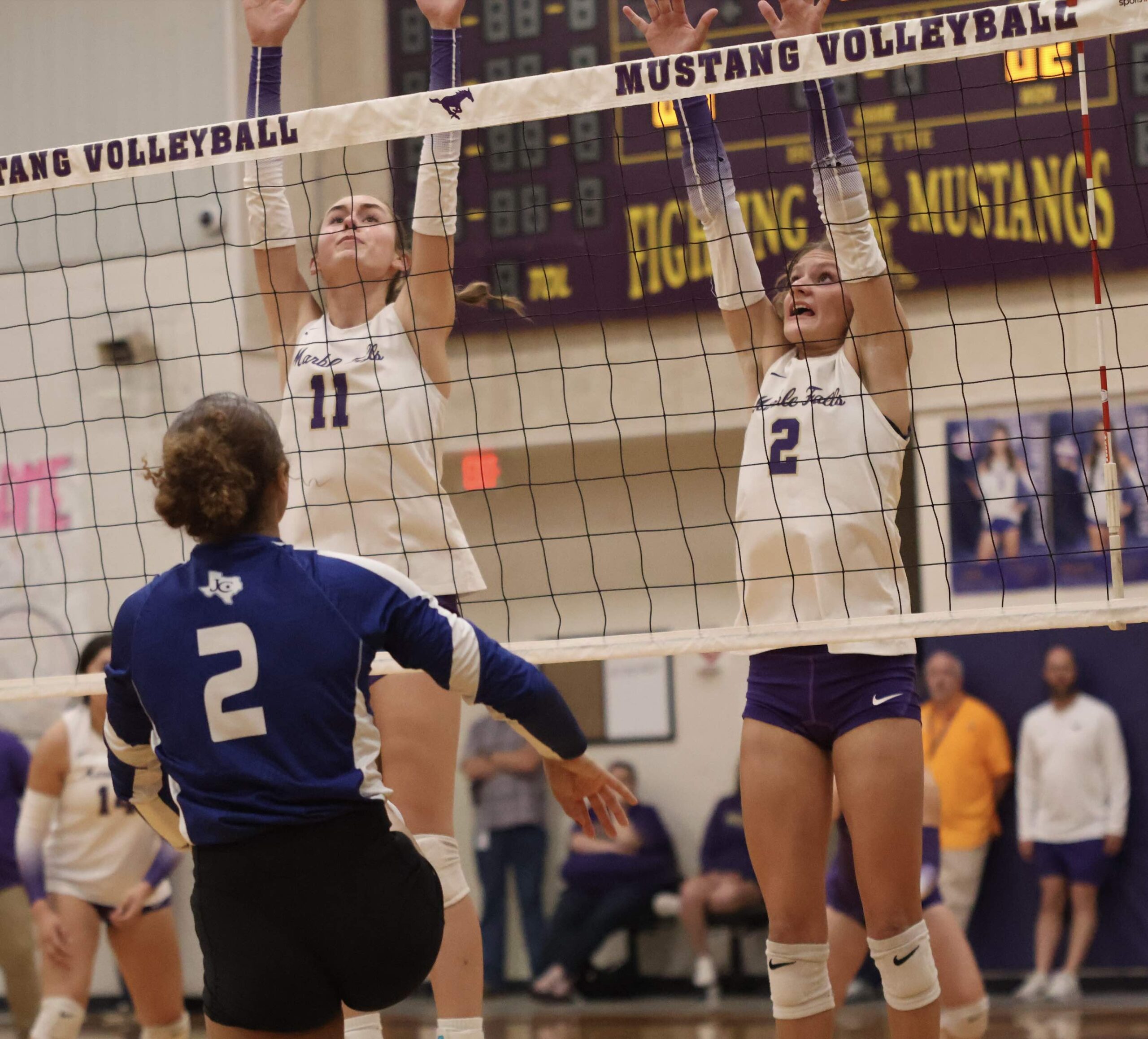 CAPTION: Katie Terrell (left) and Kate McCary have skills that help the Lady Mustangs. Staff photo by Jennifer Fierro Around 40 players are expected to compete for varsity spots on the Marble Falls High School volleyball team. Those players will get their chance during tryouts that go from 9-11 a.m. and from 1-3 p.m. Friday and Saturday, Aug. 1-2 at Max Copeland Gym on the high school campus. Aug. 1 also is the first day of official practices allowed by the University Interscholastic League, the governing body of extracurricular activities for…
