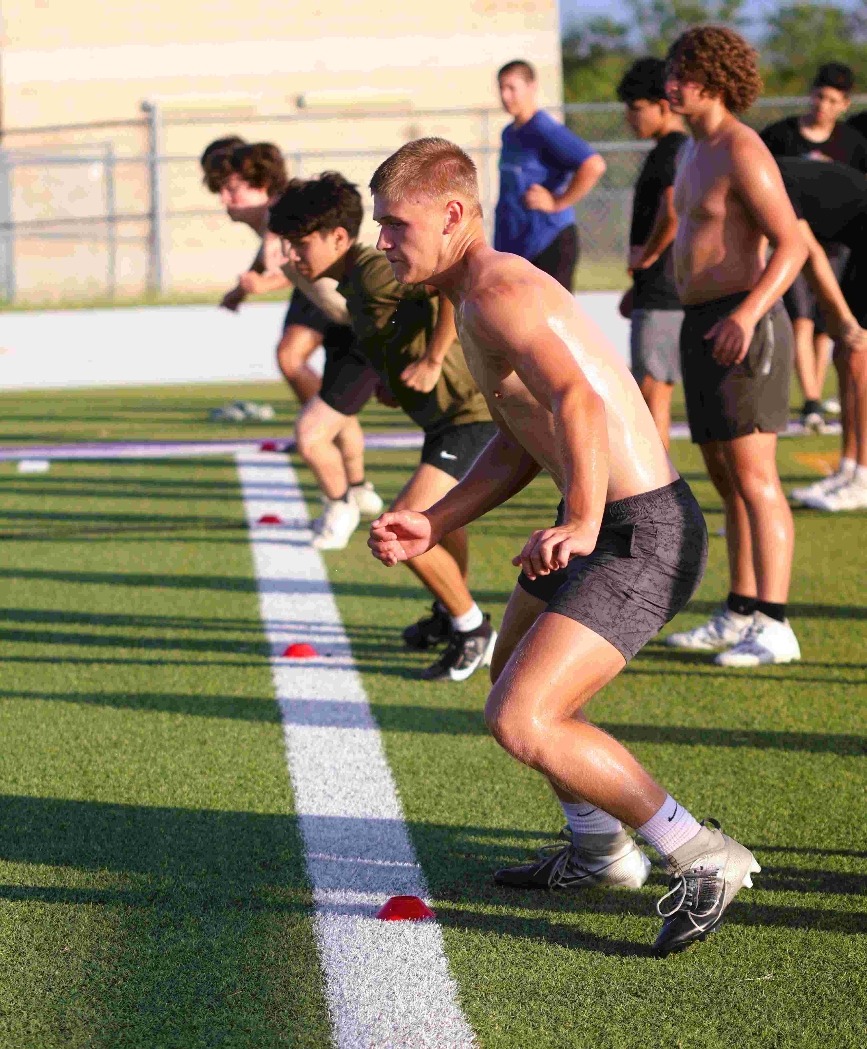 CAPTION: Crawford Mattox and his teammates begin a sprinting drill that also forces them to move from side to side after planting. Staff photo by Jennifer Fierro