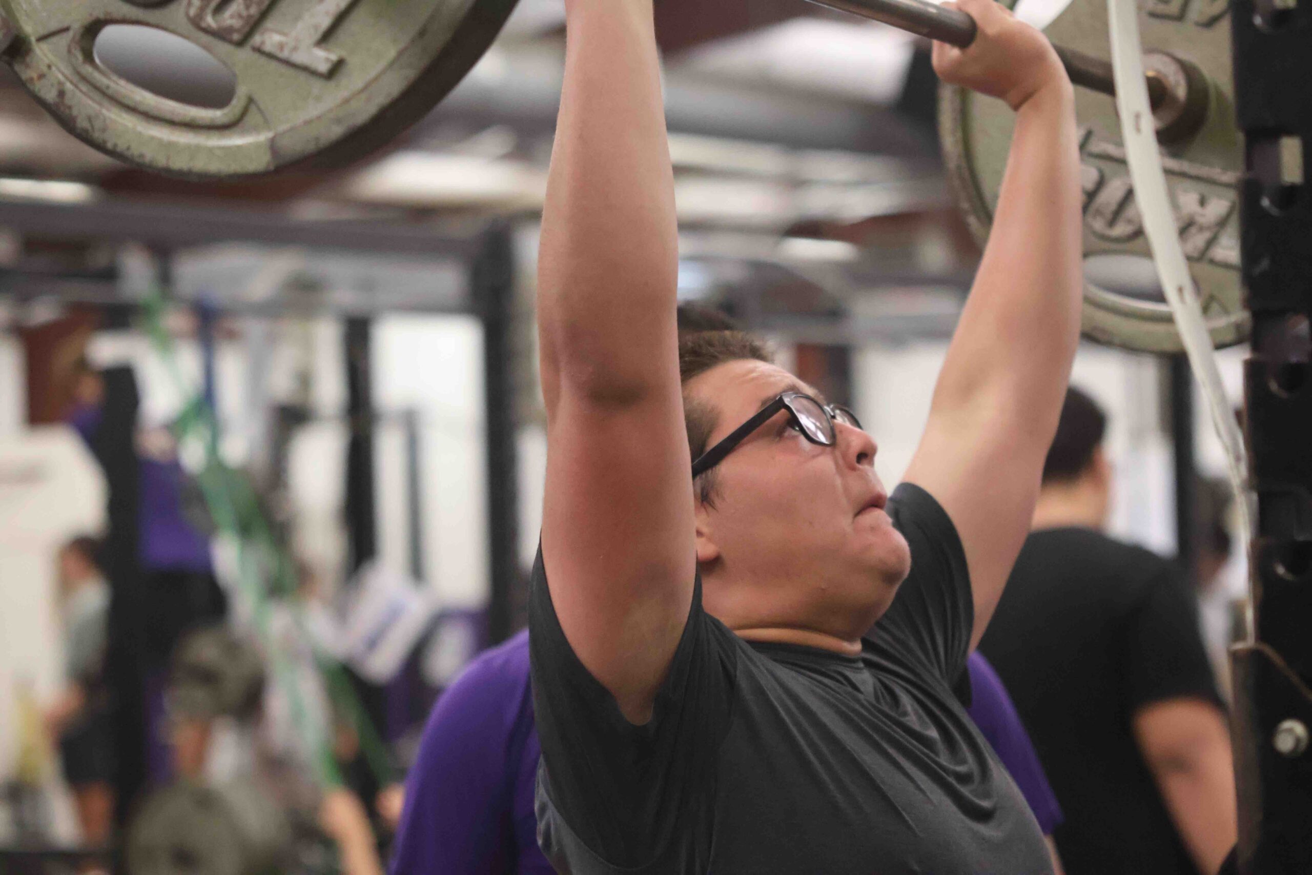CAPTION: Madden Hernandez stands and lifts this bar of weight high during the strength session of Forge ’25. Staff photo by Jennifer Fierro