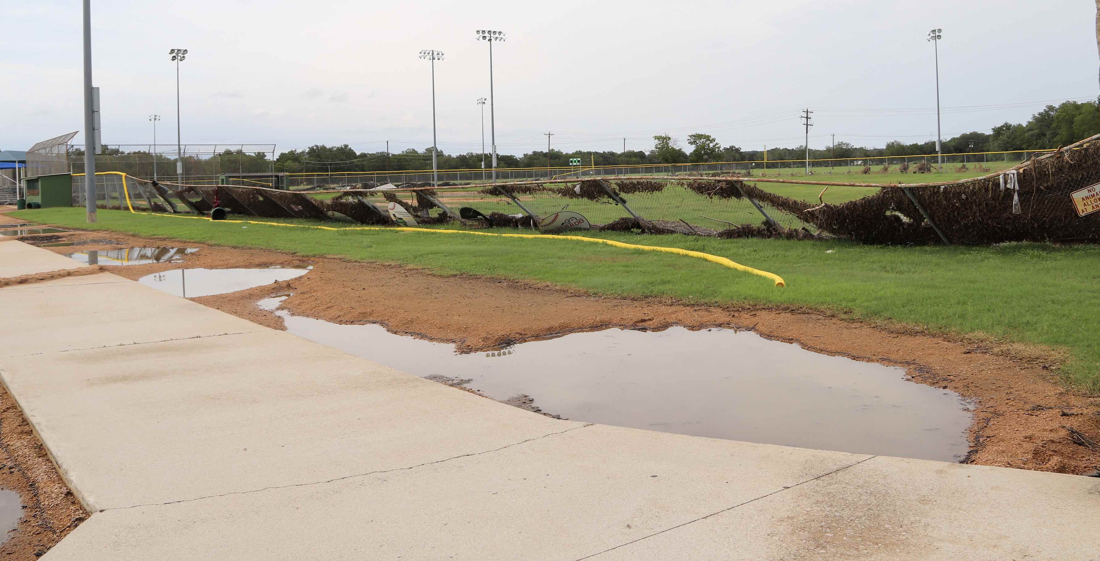 “All four fields are damaged badly,” the director said. “The fences are all washed out, the dugouts are demolished. All the dirt, bases and pitching mounds are gone. All are pretty much total rebuilds. At field number two, the dugouts are completely demolished; water tore them down. (The dugouts) are intact at the other two fields – we’ll have to repaint them. At field number one, the dugouts are OK. They need to be cleaned and repainted. The racks are still intact.”