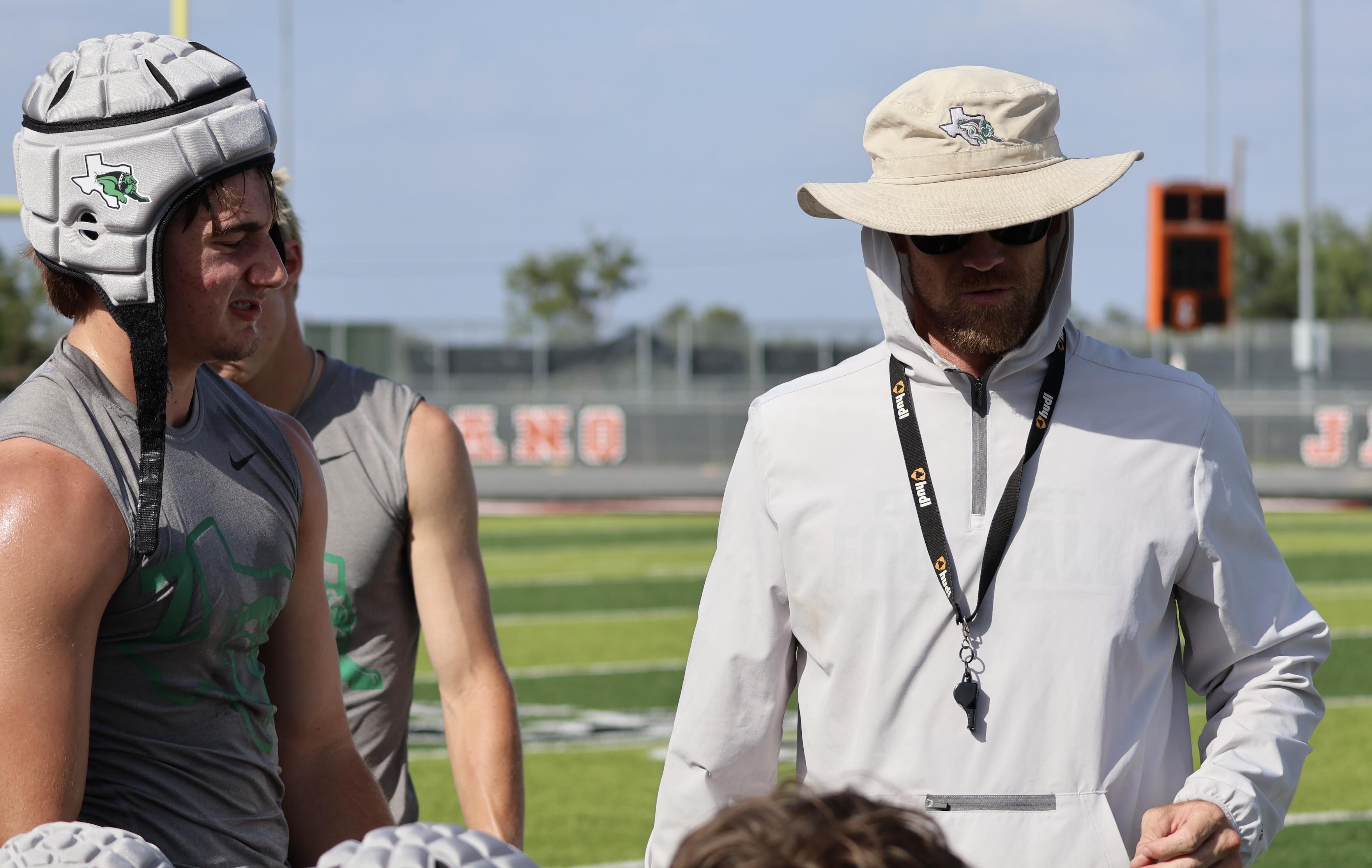CAPTION: Offensive coordinator Colton Brewer speaks to the Bulldogs as they rest between 7-on-7 contests as senior tight end Riley Howell (left) listens. Staff photo by Jennifer Fierro