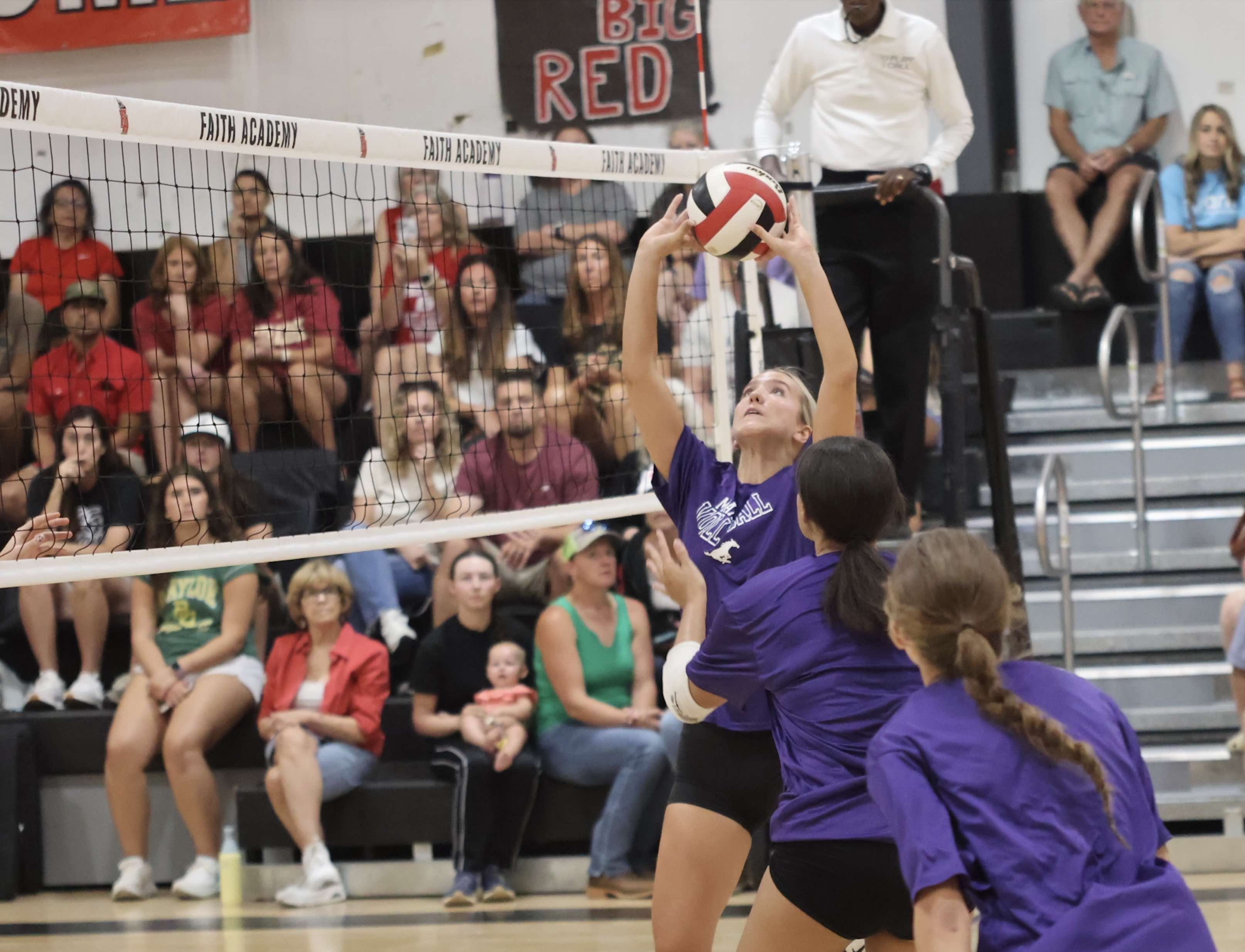 Against the Faith Academy of Marble Falls Lady Flames, the Lady Mustangs showed the base of new head coach Zoey Beard-Hanrahan’s offense that includes fake jumps all over the floor in an attempt to foul the defense and set up hitters to go one on one against blockers.