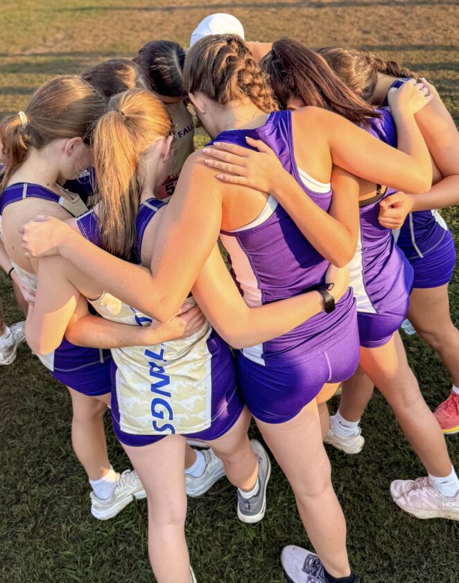 CAPTION: The Lady Mustangs in a pre-race huddle before competing in the Cedar Park Vista Ridge Invitational Aug. 22. Courtesy photo