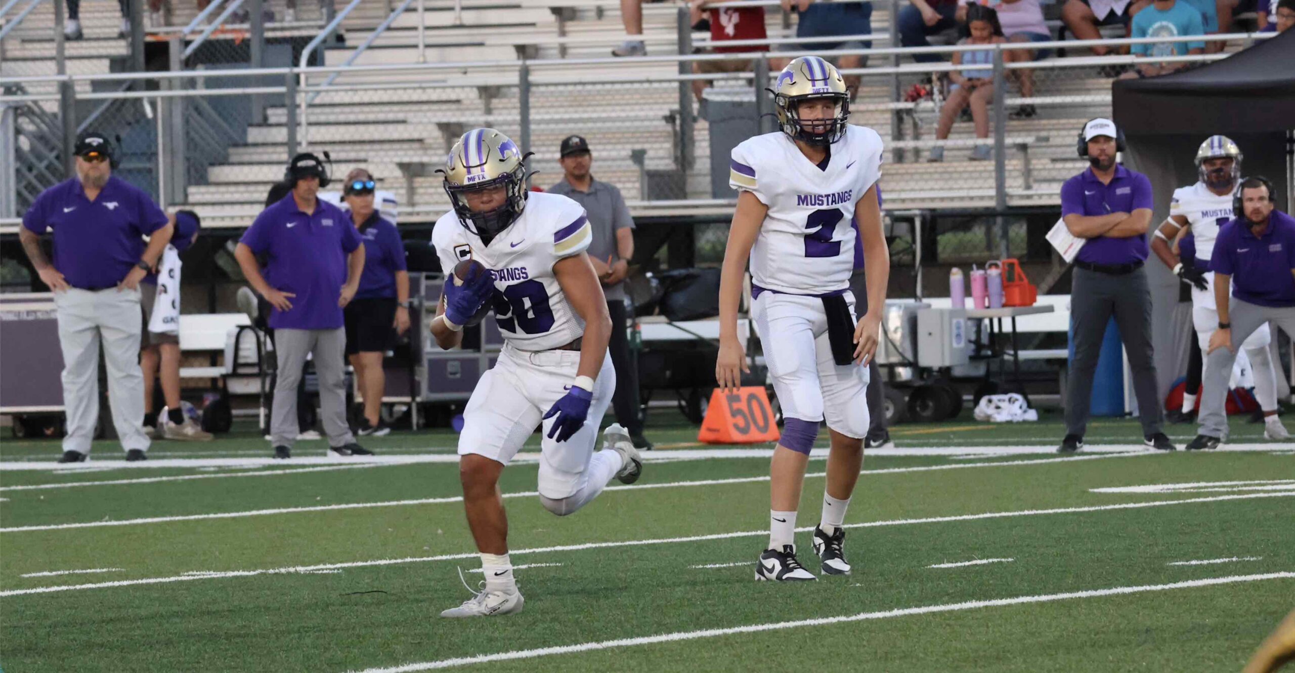 CAPTION: Marble Falls senior running back Joaquin Aguilar (left) and sophomore quarterback Anderson Liscum led the Mustangs on their longest scoring drive of night against La Vernia. Staff photo by Jennifer Fierro The Marble Falls High School football team lost to La Vernia 63-21 Sept. 26 for the Mustangs’ first road loss this season. The Bears (5-0) got a short field thanks to a solid kickoff return to start the game. La Vernia needed three plays to score highlighted by junior quarterback Cooper Null’s eight-yard run to the end zone.…