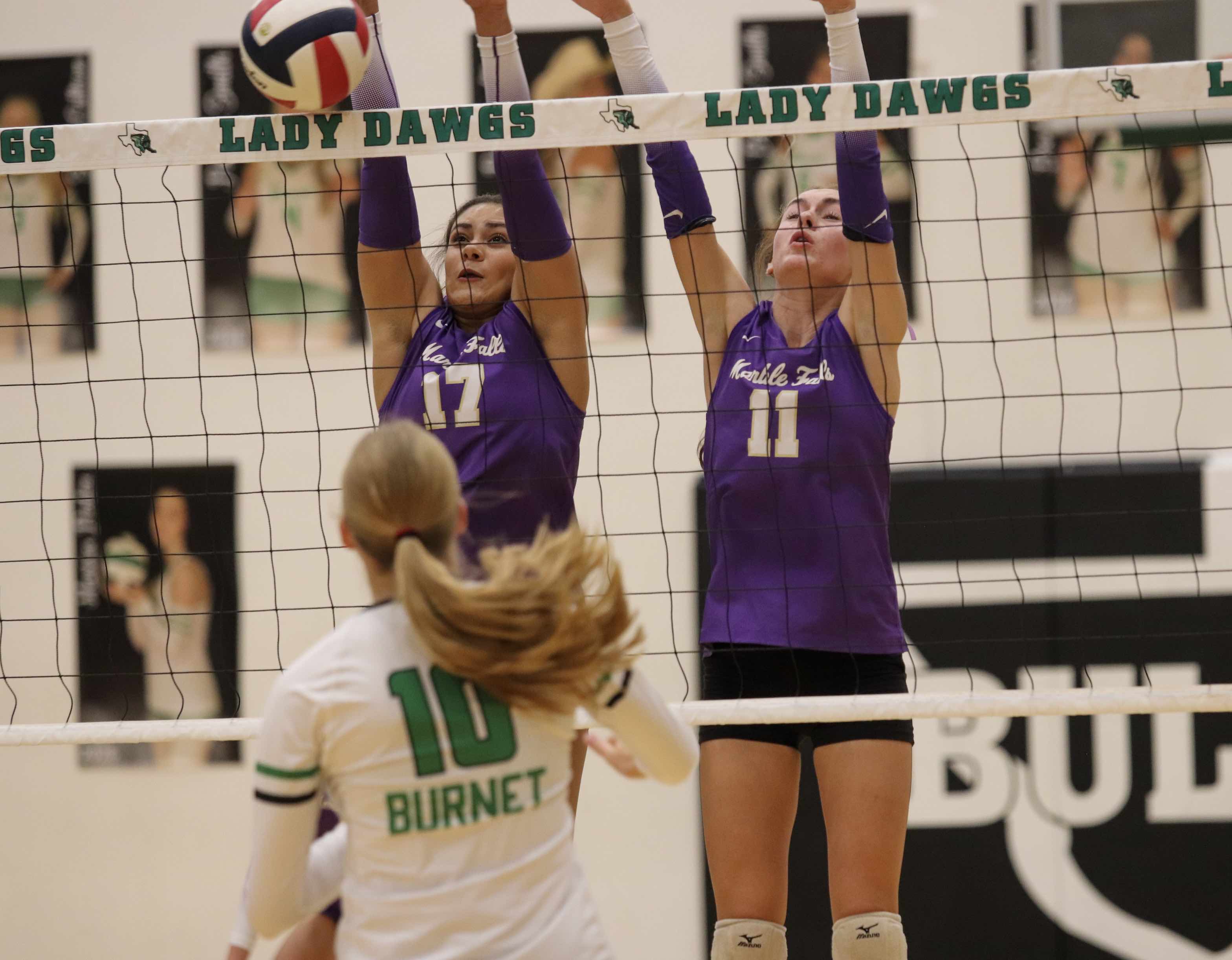 CAPTION: Marble Falls junior middle blocker Amaris Mitchell-Ochoa (17) and junior outside hitter Katie Terrell block a Burnet kill. Photo by Martelle Luedecke/Luedecke Photography