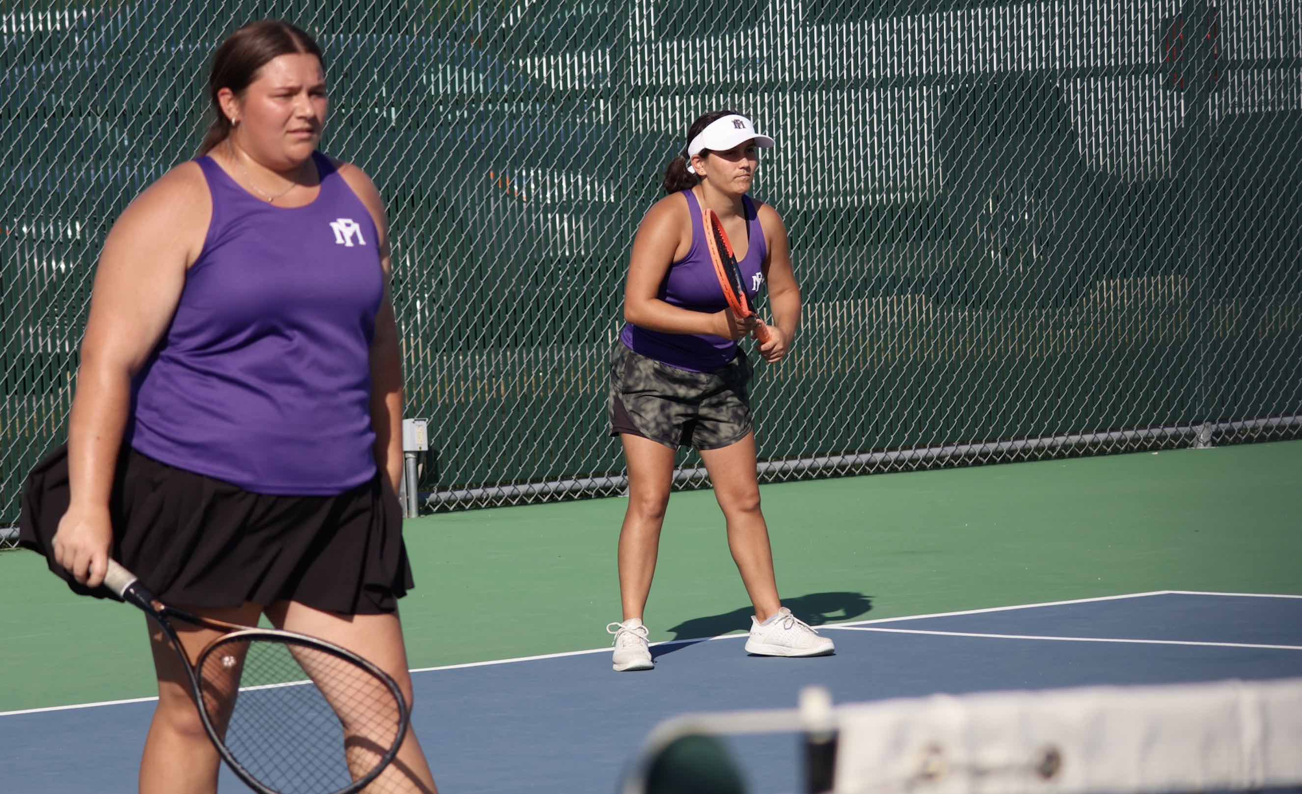 CAPTION: Sophia Trudeau (left) and Nevaeh Nelson (Montoya) weren’t challenged in their match at No. 1 girls doubles. Staff photo by Jennifer Fierro
