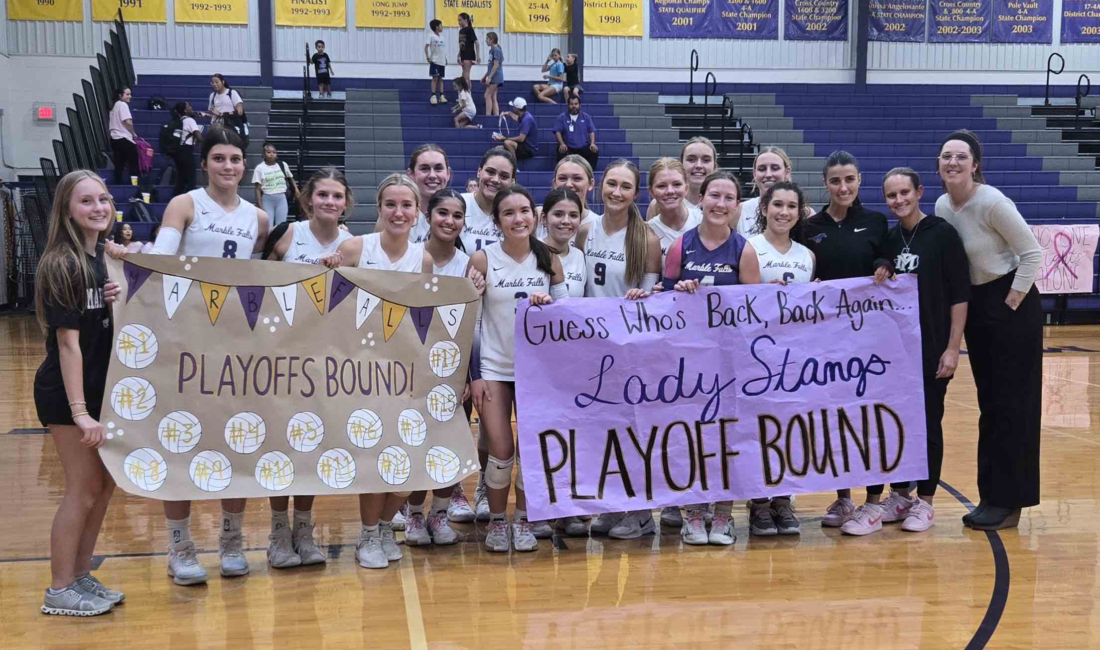 The Marble Falls High School volleyball team is back in the playoffs after sweeping Taylor 25-16, 25-19, 25-10 Oct. 21 in the final regular season match in Max Copeland Gym and Georgetown Gateway beating Jarrell at the same time.