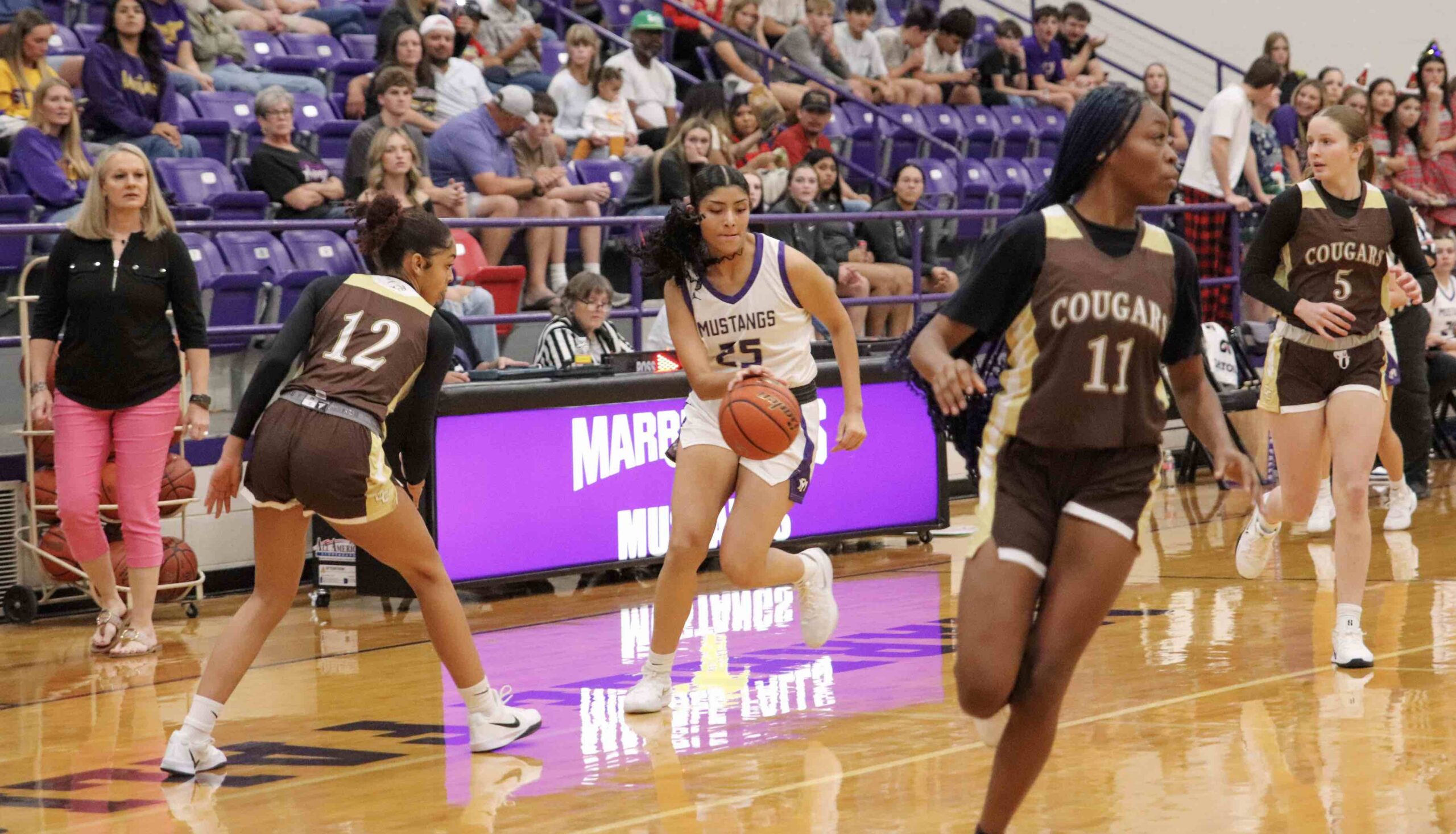 CAPTION: Marble Falls senior forward Leslie Reynoso is back for one more year to help the Lady Mustangs make another playoff run. Photo by Martelle Ludecke/Luedecke Photography The Marble Falls High School girls basketball team defeated Austin McCallum 41-37 Nov. 11 to end a two-game losing skid. Freshman Emma Martin hit a shot and sophomore forward Addy Wood nailed two free throws to to secure the win. The Lady Mustangs (1-2) and the Lady Knights played to an 11-11 tie after the first period. Then Marble Falls outscored McCallum 15-8…