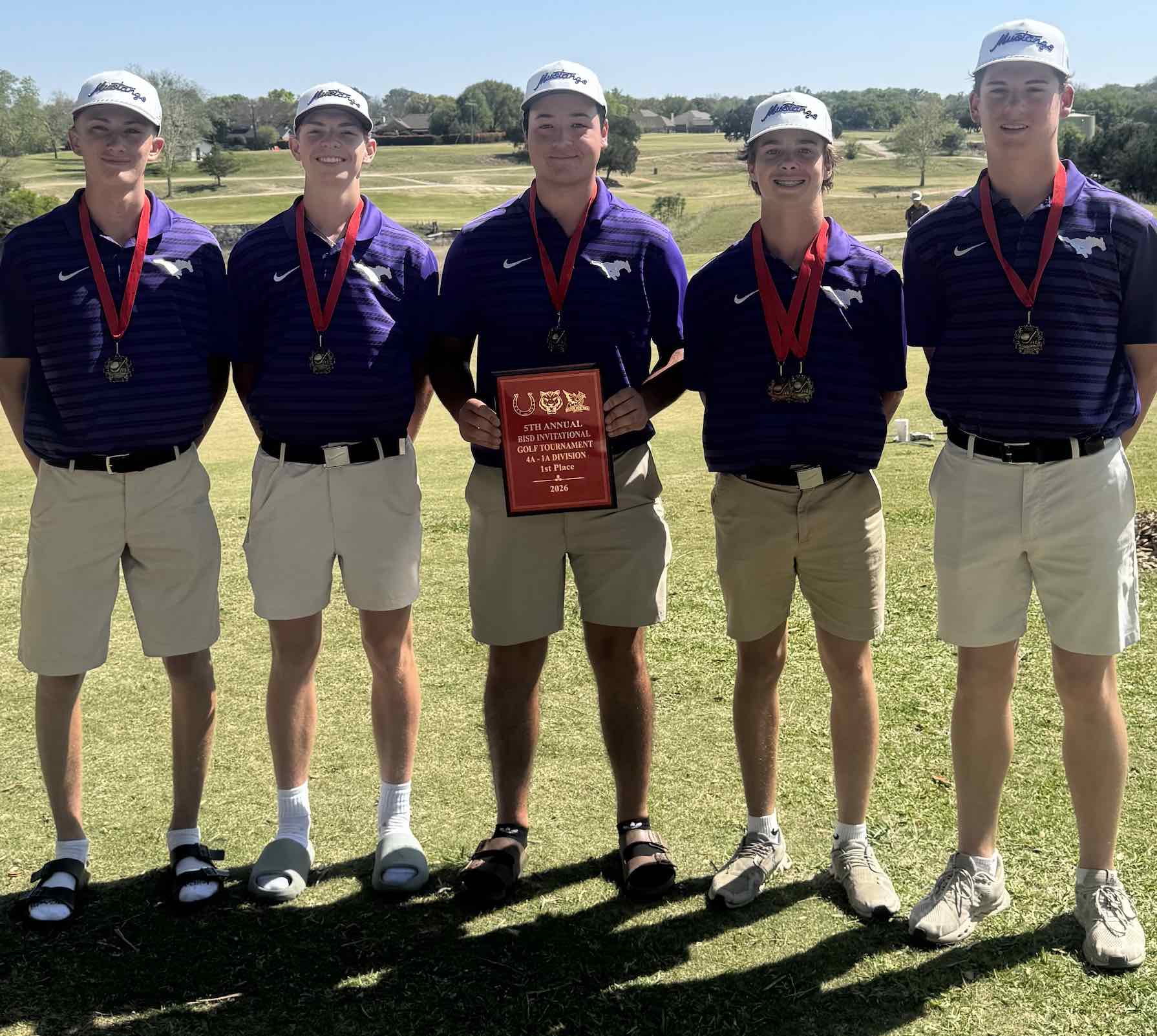 CAPTION: The Marble Falls High School boys golf team won the Fifth Annual Belton ISD Invitational 4A Division I golf tournament March 26 with a team score of 313. The Mustangs are John Srnensky (left), who shot a 79, Beckett Berkman, who scored an 88, Camilo Montez, who finished with a 77, Drew Whittle, who shot a 77 to finish fifth in the individual standings, and Gage Goebel, who scored an 80. Marble Falls will compete in the District 24-4A Tournament at the Legends Golf Course and Villas Wednesday and…