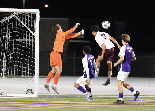 CAPTION: Marble Falls goalie Jett Marcum (left) ensures San Antonio Davenport is turned away again. Photos by Shaunna Marcum/ShaunnaLisa, Cliffhanger Loop Productions