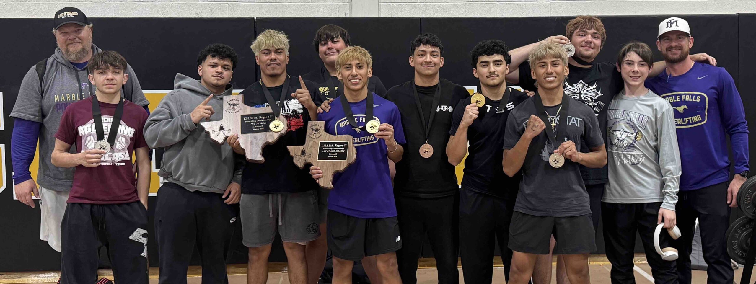 CAPTION: The Marble Falls boys powerlifting team with their Region 2, Division 2 championships. The Mustangs are Tyler McIntyre (front row, left), Julio Gaytan, Arnulfo Salazar, David Dominguez, Josue Fonseca, Adrian Arredondo, Daniel Dominguez, Easton Carey; head coach Karl “Beef” Bielfeldt (back row, left), Jaxson Bales, Keaton Proctor and assistant coach Logan Simmons. The Mustangs also won the title in 2024. Courtesy photo