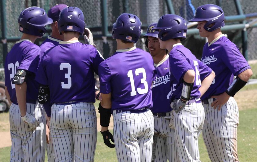 CAPTION: The many Mustang batters in the first inning who are surrounding head coach Tyler Porter who either will bat or are already on base are Landon White (20, left), Anderson Liscum, Owen Nash, Ben Sowers, Crawford Mattox and Cade Briseno. Staff photo by Jennifer Fierro