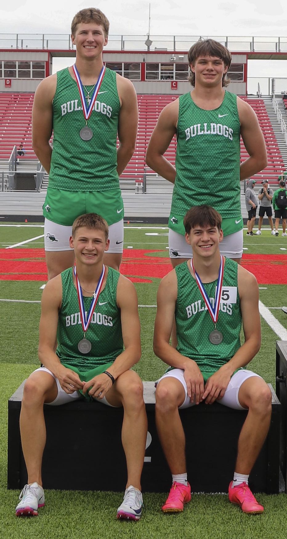 CAPTION: The 400-meter really team of Colt McGraw (seated, left), Clay Lamb, Cohen Jorpeland (standing, left) and Caden Farmer and their silver medals. Photo by Martelle Luedecke/Luedecke Photography