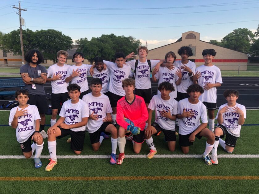 CAPTION: The 2022 Marble Falls Middle School boys soccer team, coached by Aaron Jimenez (standing, left), that went 8-0 includes some familiar faces. Many of these Mustangs were on the varsity team that reached the Class 4A Division I state semifinal in 2026. File photo