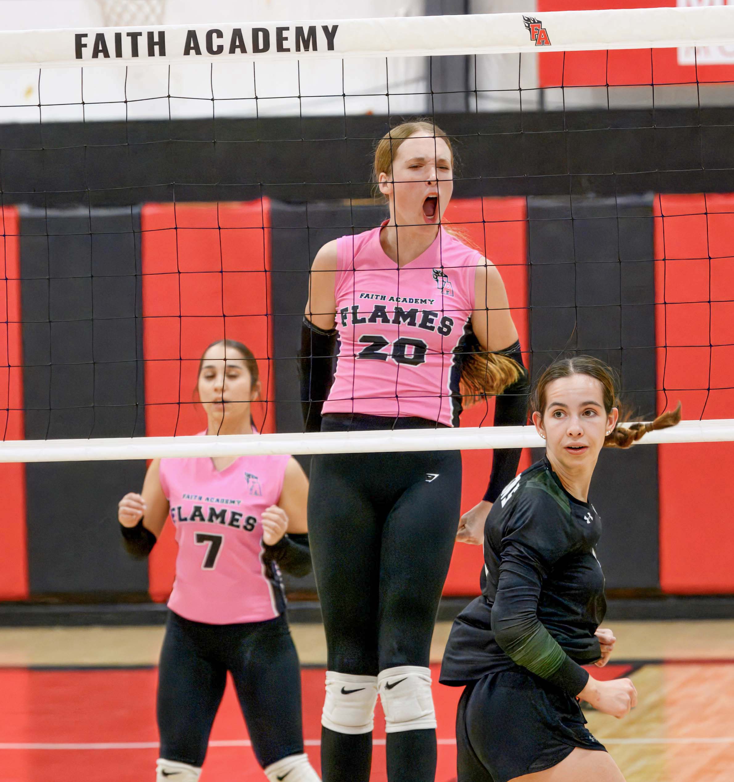 CAPTION: Faith Academy sophomore Ella Claiborne reacts to her one of her 384 kills, which is tops for the Lady Flames in this category. Photo by Stennis Shotts The Faith Academy of Marble Falls volleyball team will welcome Conroe Covenant in an area round of the Class 3A playoffs of the Texas Association of Private and Parochial Schools. The match begins at 5 p.m. Tuesday, Nov. 4, at The Fire Pit on the Faith campus. Lady Flames head coach Erin Sawyer said the Lady Cougars feature “a strong middle blocker…