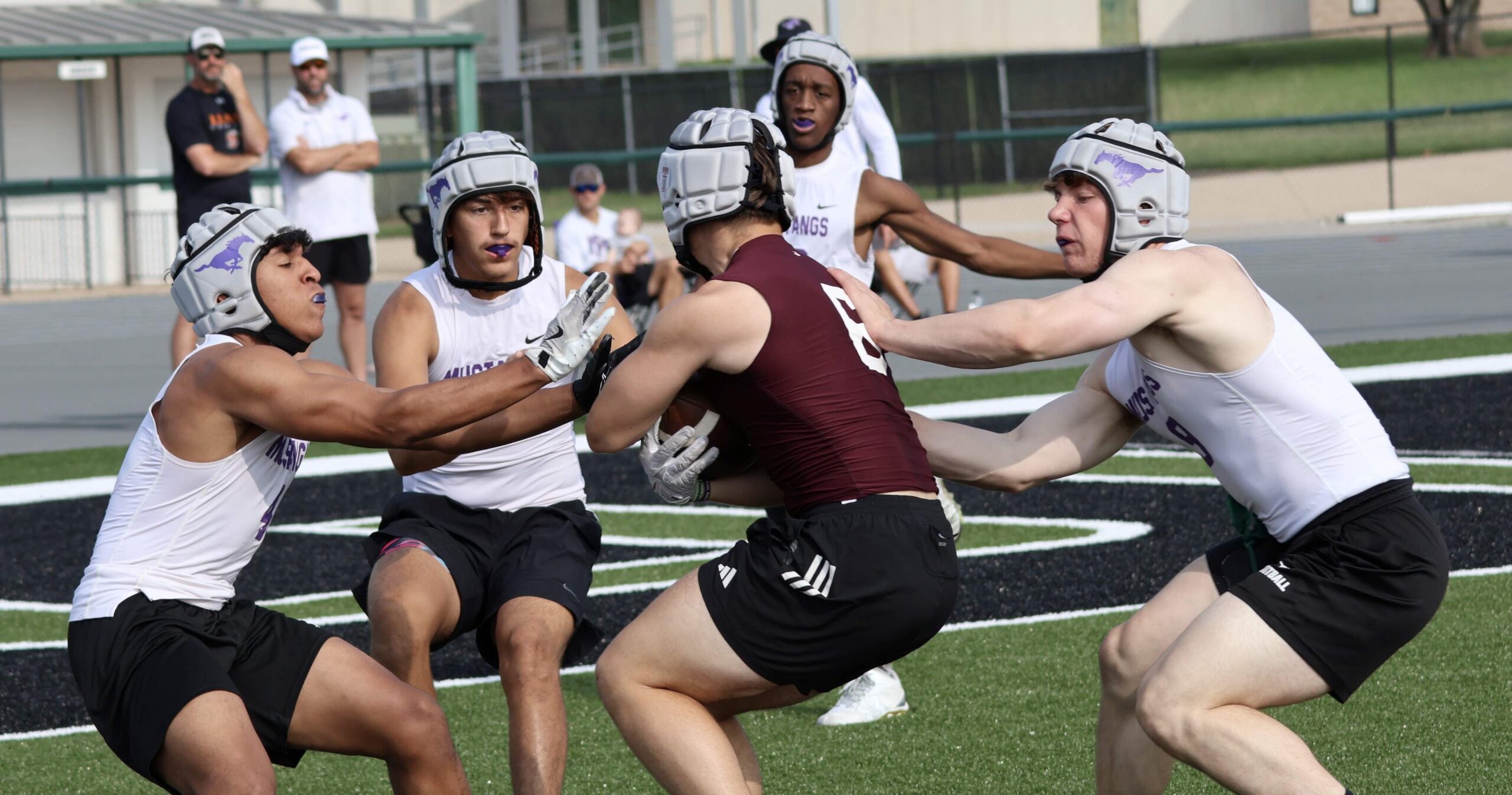 CAPTION: Marble Falls defensive backs C.J. Alexander (left), Leroy Roach and Gregory Lemon and linebacker Doak Timmerman showed a lot of rapport during 7-on-7 play. Staff photos by Jennifer Fierro Though offense tends to be the top football conversation throughout the offseason, the defense is of equal importance to any locker room. Including the one located inside the Marble Falls High School field house. Since the ending of the 2025 baseball season, the competition for the Mustangs’ starting quarterback remains ongoing. But several defensive players have emerged as the leaders…