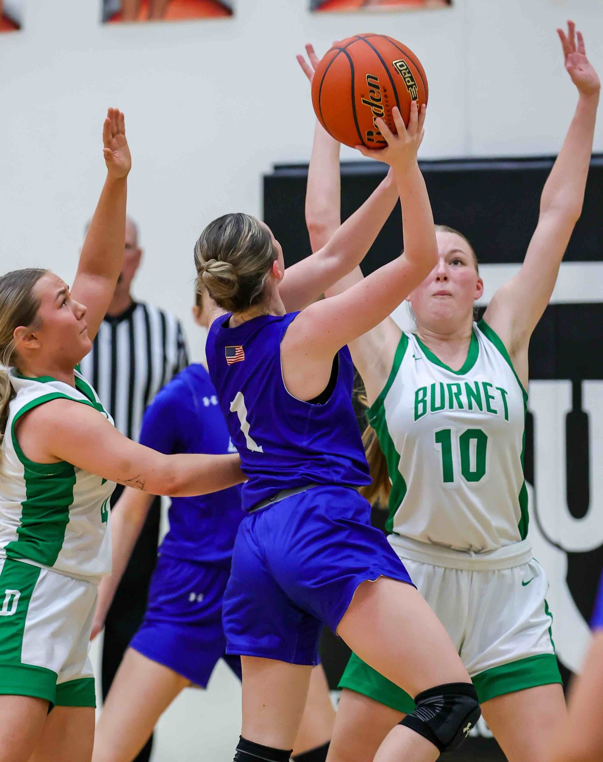 CAPTION: Burnet seniors Peyton Allen (left) and Wrigley Mulhollan hold their grounds as Lampasas Junior guard Abra White tries to complete a pass. Photos by Christopher A. Miles/Christopher A. Miles Photography The Burnet High School girls basketball team lost to Lampasas 52-32 Jan. 23 and Jarrell 40-36 Jan. 20 in District 24-4A play. “They did give it everything they had (against Jarrell),” head coach Kim Payten said. “They played hard and we almost pulled it off. We play a lot better on the road. Jarrell was probably one of the best we’ve…
