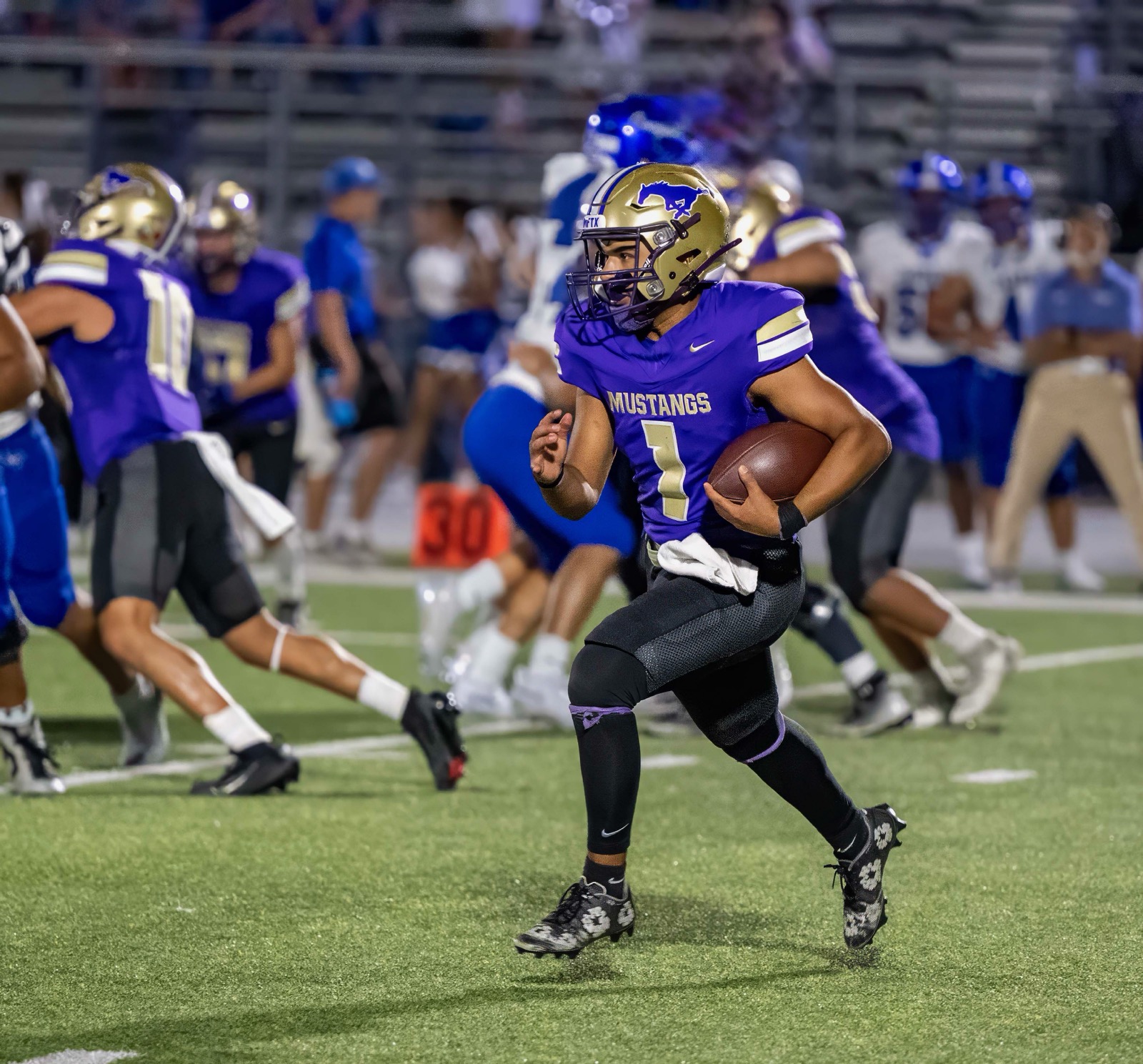 CAPTION: Marble Falls senior quarterback Atreyu Machacek took led the Mustangs to a fourth-quarter score against Jarrell Sept. 5. Photo by Stennis Shotts The Marble Falls High School football team lost to Jarrell 41-7 Sept. 5. The Mustangs’ lone score came in the fourth quarter when senior tight end Noah Ortiz caught a tipped ball in the end zone from 19 yards out from senior quarterback Atreyu Machacek. The 15-play drive took 8 minutes and 17 seconds to complete. By then, the Cougars (2-0) had pulled their starters. “It was…